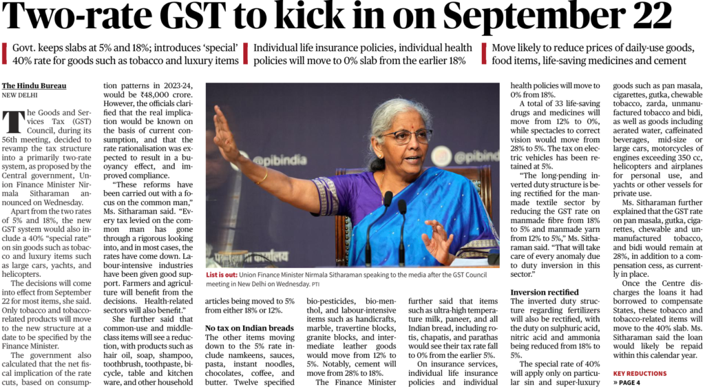 - GST Council approves rate rationalisation with a focus on Common-man, Labour-intensive Industries, Farmers and Agriculture, Health, Key Drivers of the economy